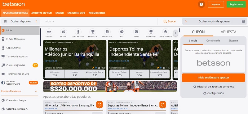 El sitio web de Betsson tiene una interfaz muy intuitiva, ordenada y de fácil navegación. Cuando ingresas en el menú principal, puedes escoger la opción de Apuestas deportivas, Apuestas en vivo, Casino, Casino en vivo y Promociones, como el Reto Millonario y los torneos de casino y de apuestas.